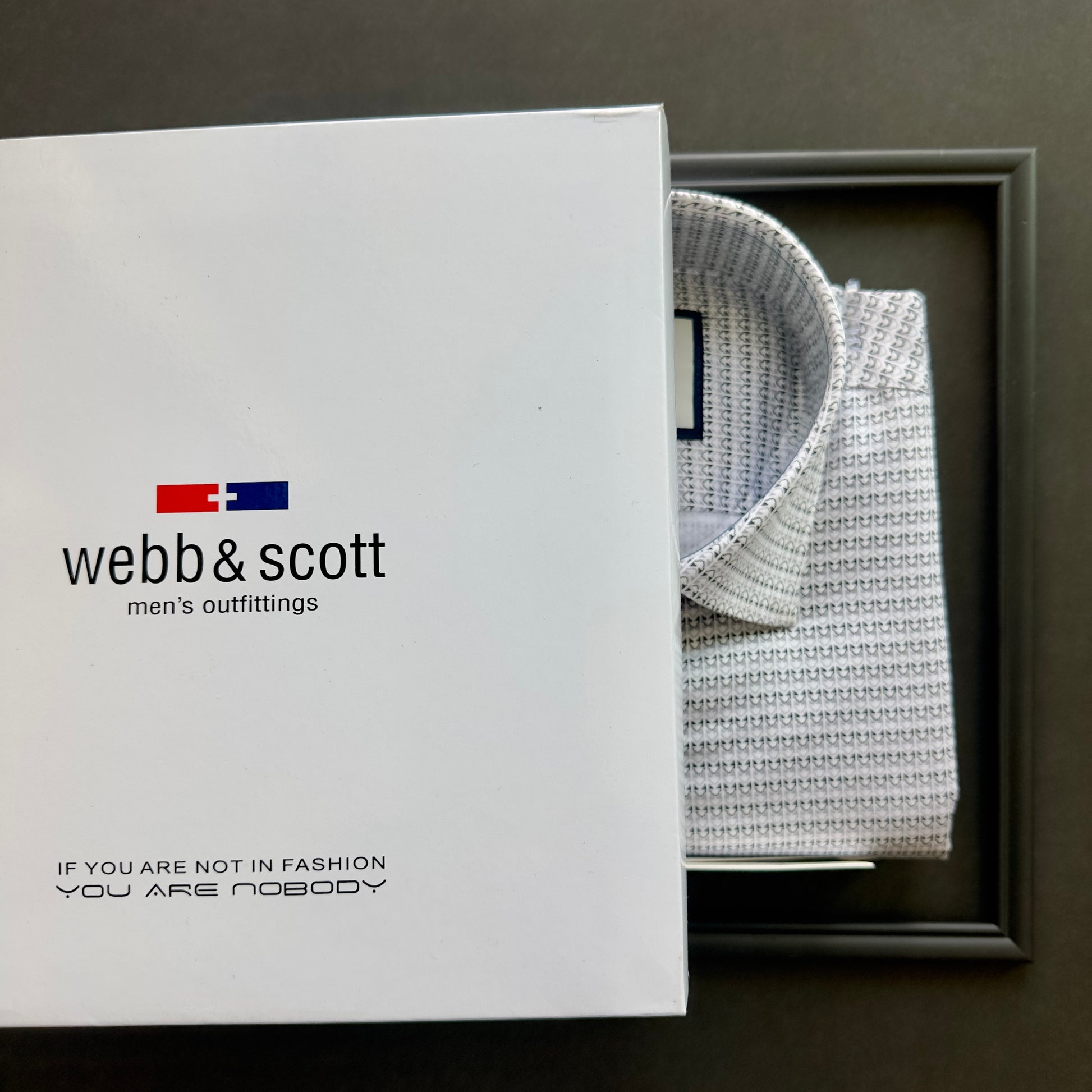 Webb & Scott geometric print shirt in white and black. Premium cotton blend, modern design, and elegant packaging.